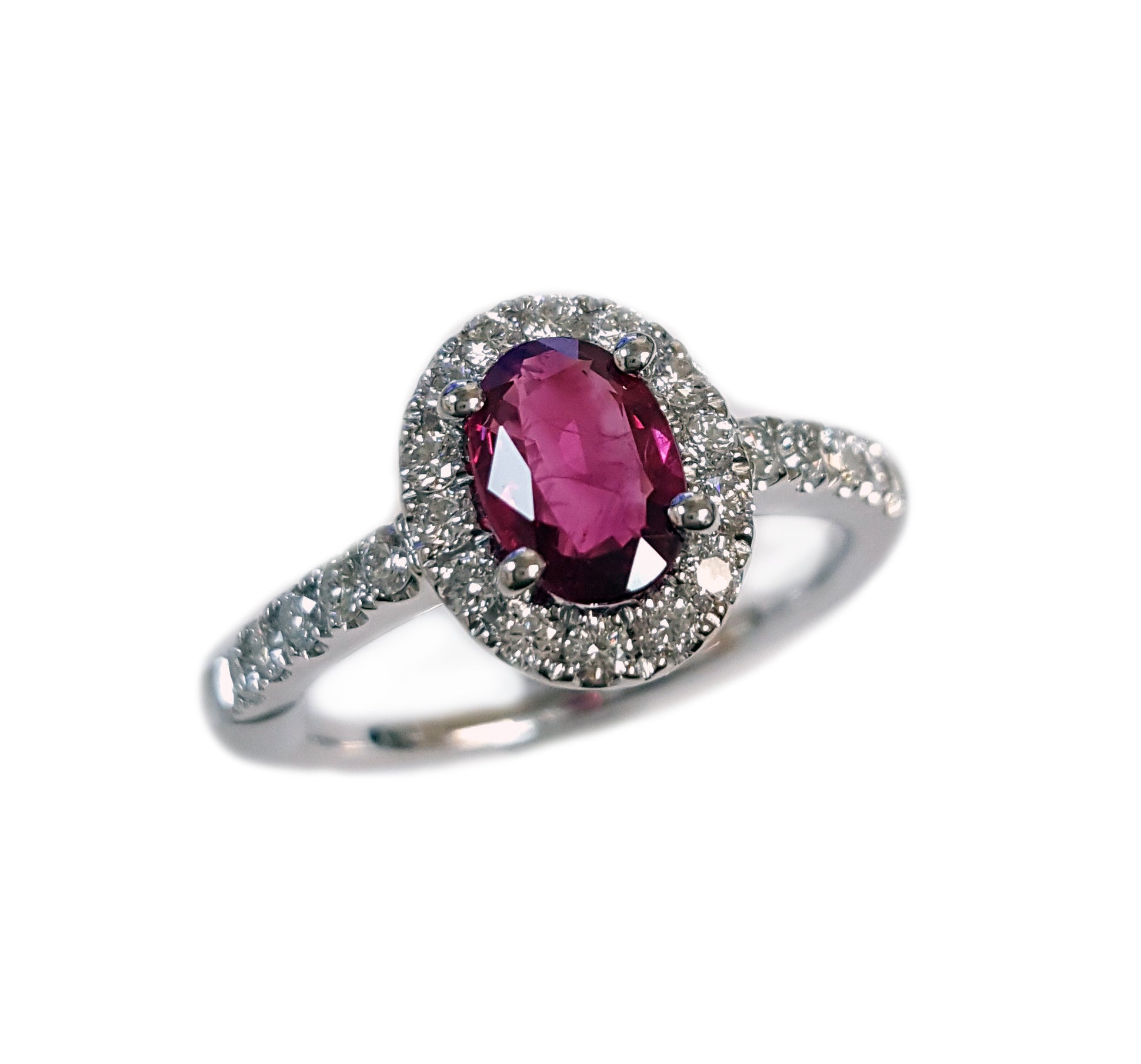 14K White Gold Halo Fashion Ring set with 1 Oval-shape Ruby (1.37ctw) Red Shades Color Round-shape side Diamond (0.44ctw) G-H Color SI Clarity. This ring's total carat weight is 1.81ctw.