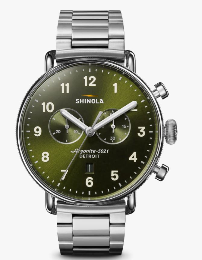 Built using top loaded case construction, the Canfield Chronograph features an open dark olive dial that showcases refined minute track and slim, diamond-cut hands. Finished with stainless steel case and bracelet, this is sophistication achieved through simplicity.